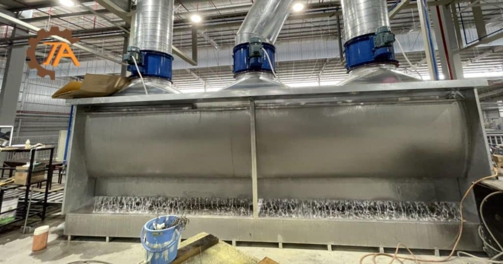 - Màng nước giữ bụi sơn lại, nước chảy về bể lắng: Các hạt sơn va vào màng nước và bị cuốn trôi xuống bể chứa. Tại đây, cặn sơn nặng hơn sẽ lắng xuống đáy.