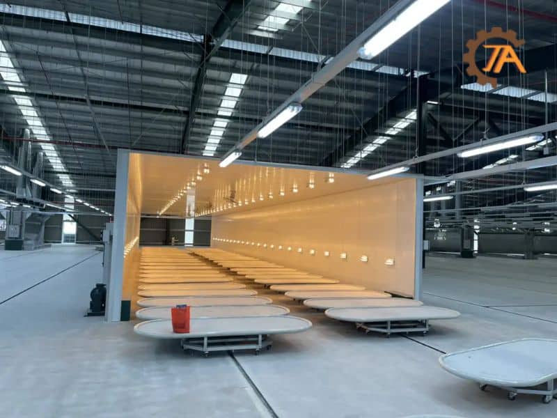 - Phun sơn: Khi xe pallet di chuyển vào buồng sơn, hệ thống tự động xoay sản phẩm 360 độ, giúp sơn được phủ đều khắp bề mặt sản phẩm. Có thể sử dụng sơn màng nước hoặc sơn khô, tùy thuộc vào yêu cầu kỹ thuật của sản phẩm.