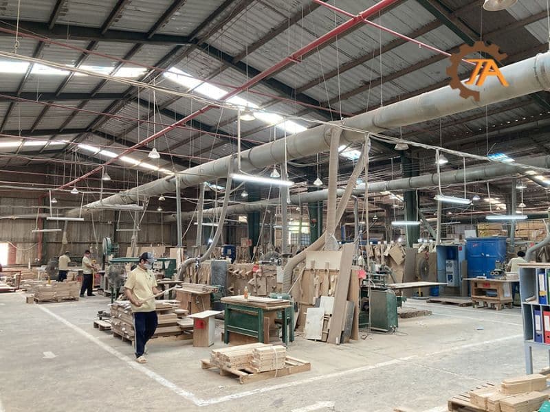 Hệ thống hút bụi ngành gỗ Trường An được sử dụng rộng rãi để hút bụi máy cưa, xử lý bụi từ các công đoạn gia công gỗ như phay, chà nhám, và cắt, giúp giảm thiểu bụi trong không khí (thường xuống dưới 5mg/m³ theo tiêu chuẩn ngành) và cải thiện điều kiện làm việc. Trong các xưởng sản xuất quy mô vừa và nhỏ, hệ thống này không chỉ loại bỏ bụi mịn mà còn hỗ trợ thu hồi nguyên liệu phụ như mùn cưa, mang lại giá trị kinh tế bổ sung cho doanh nghiệp bằng cách tái sử dụng hoặc bán nguyên liệu này. Ngoài ra, trong các nhà máy lớn, hệ thống giúp giảm tiếng ồn (thường từ 75dB xuống 60dB theo thực tế thị trường) và cải thiện luồng không khí, tạo môi trường làm việc thoải mái hơn, đặc biệt trong các mùa sản xuất cao điểm như mùa khô hoặc mùa vụ xuất khẩu. Điều này cũng góp phần giảm nguy cơ hỏa hoạn do bụi gỗ tích tụ, một mối nguy tiềm ẩn trong ngành.