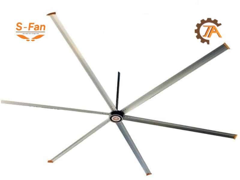 Quạt hoạt động theo cơ chế HVLS: tốc độ quay chậm nhưng tạo ra lưu lượng gió lớn. Khi quạt quay, không khí được đẩy xuống sàn và lan tỏa theo phương ngang, hình thành vòng tuần hoàn khép kín.