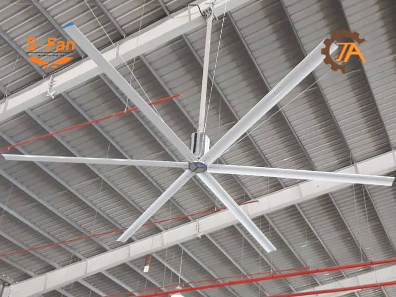 - So với quạt 7.3m: kích thước nhỏ hơn một chút, dễ lắp đặt ở các nhà xưởng có trần thấp hơn, đồng thời chi phí đầu tư ban đầu thấp hơn.
