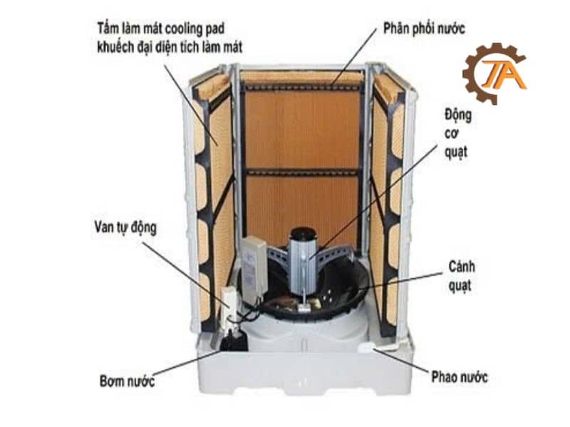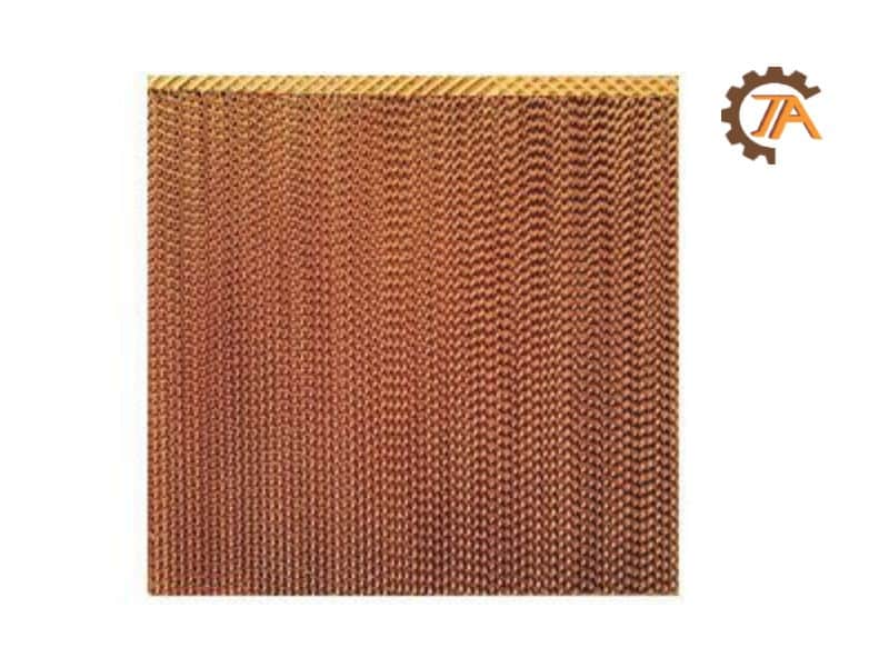 Tấm làm mát máy làm mát công nghiệp thường có cấu trúc dạng tổ ong, giúp tăng diện tích tiếp xúc giữa nước và không khí. Nước được bơm tuần hoàn từ trên xuống, chảy qua các khe của vật liệu, trong khi không khí nóng đi qua sẽ được làm mát nhờ quá trình bay hơi. Thành phần chính của tấm gồm lớp vật liệu trao đổi nhiệt, khung đỡ và một số loại có lớp phủ chống nấm mốc để tăng tuổi thọ.